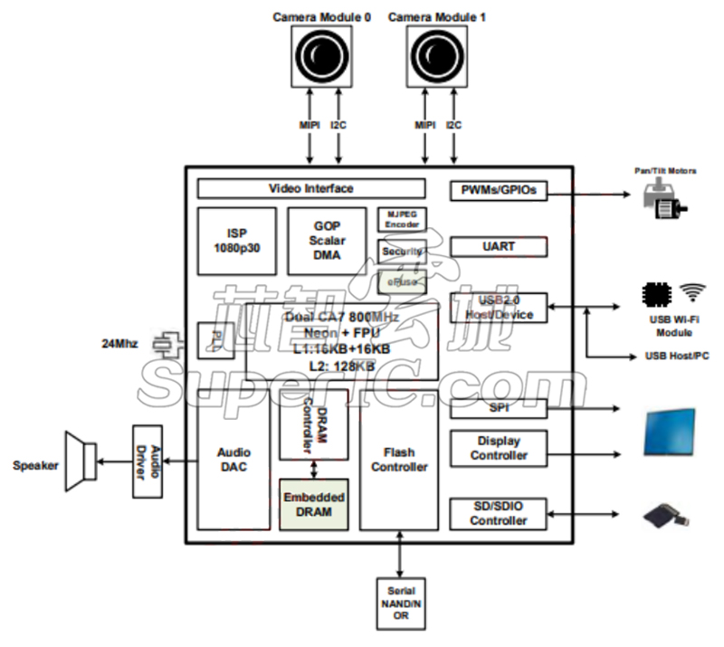 SSD210 is a highly integrated face access and intelligent display solution with ARM Cortex-A7 main chip, dule core, 1GHz; built-in DDR2, 512Mb; integrated image sensor interface, advanced ISP; JPEG encoder support; 2D graphics engine support; TTL/Serial RGB display support and picture quality adjustable engine, Resolution up to 1280x800@60fps; SPI-Nor/Nand Flash support.
