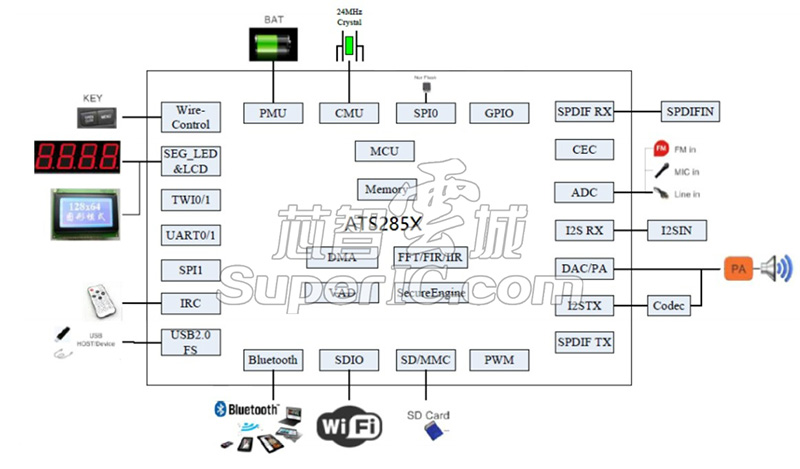 ATS2855 is a highly integrated Bluetooth audio single chip.ATS2855 has many rich interfaces, such as SDIO, SPI, USB2.0, UART, I2S, PWM, IR, TWI, etc.
