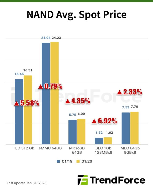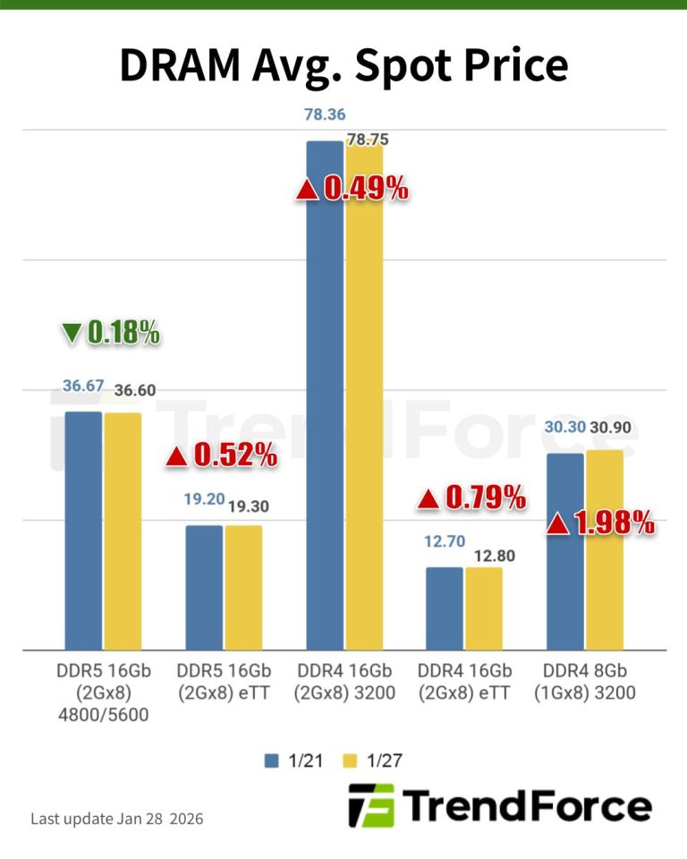 According to TrendForce’s latest memory spot price trend report, regarding DRAM, rising DDR4/DDR5 prices and challenges in passing on costs have stalled factory procurement, leaving spot market transactions stagnant, yet quotations stay elevated amid ongoing supply shortages. Meanwhile, in NAND, spot prices have been rising, though some buyers are hesitant amid high prices, weak consumer demand, and uncertainty over fab utilization during the upcoming Chinese New Year. Details are as follows: