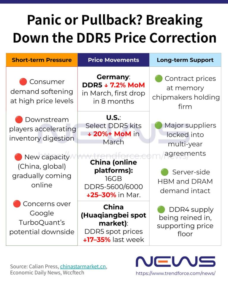 On balance, the current DDR5 price correction appears to be a consumer-driven, short-term adjustment rather than a definitive signal of structural demand deterioration. Contract prices have remained firm so far, and server-side HBM and DRAM demand has remained largely intact, with major suppliers reportedly locked into multi-year agreements with key clients. For now, the industry’s long-term fundamentals appear largely unchanged—but whether the recent turbulence proves to be a healthy market cool-down or an early warning sign may only become clear in the months ahead.