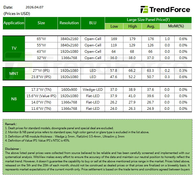 Entering April, some brands continue to maintain demand for TV panels, particularly for large-size segments. At the same time, component costs for panels have continued to rise, driven by war-related energy issues and semiconductor capacity crowding. As a result, panel makers are taking a more proactive stance on pricing, aiming to sustain upward momentum in TV panel prices in April to offset cost pressures.