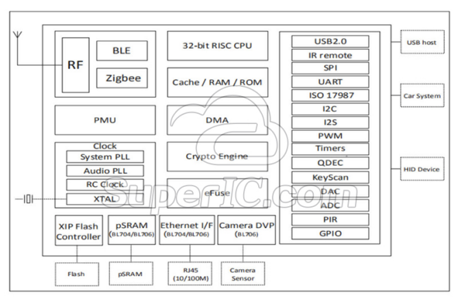 2. The BL702 wireless subsystem includes 2.4G radio, BLE + zigbee baseband and MAC design. The micro-controller subsystem contains 32-bit RISC CPUs, caches and memory. The power management unit controls the ultra-low power consumption mode. In addition, various security functions are also supported. Its peripheral interface is very rich, including I2C, SPI, ADC, GPIO, PWM, KeyScan, which is convenient for developers to debug and use.
