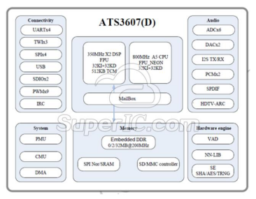 The ATS3607d is a highly integrated USB conference audio solution. The main chip is an ARM cortex V7-A architecture clocked at 800M and includes multiple 8-channel D-MIC interfaces, a 6-channel A-MIC high performance ADC and a stereo high performance DAC.