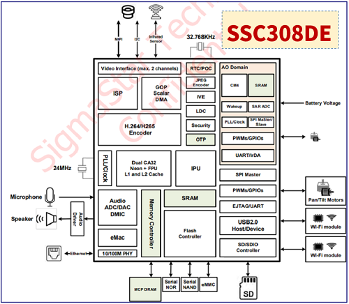 The Sigmastar SSC308DE is a highly integrated, high-resolution SoC chip designed for intelligent video recording with low power consumption. It is suitable for applications such as IPC cameras and other battery-powered devices.